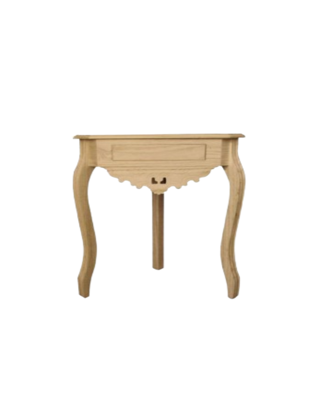 El cajón ofrece almacenamiento adicional para objetos pequeños, como llaves, documentos o accesorios decorativos, mientras que su diseño elegante con detalles torneados en las patas y su forma triangular se adapta perfectamente a rincón de recibidores, pasillos o salones.