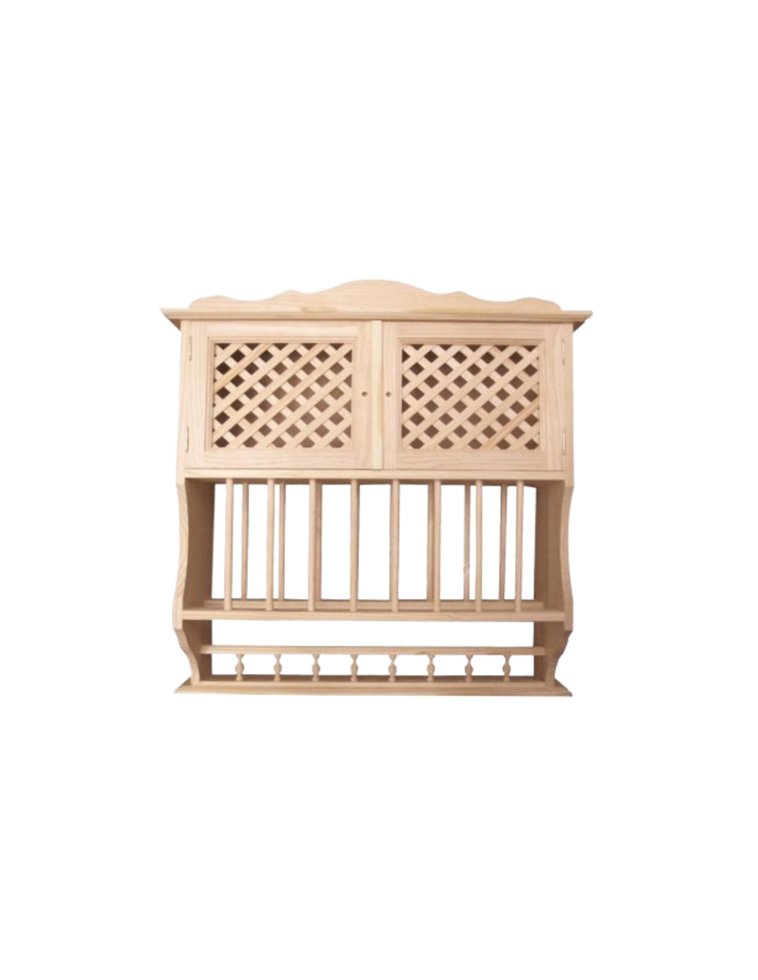 El Platero 2 Puertas Celosía con Barandilla es una pieza de Madera de Pino fabricada en España, que combina un diseño clásico con detalles contemporáneos. Su celosía y barandilla le dan un toque distintivo, convirtiéndolo en un mueble funcional y elegante para almacenar y exhibir vajilla, cristalería u otros objetos de forma ordenada.