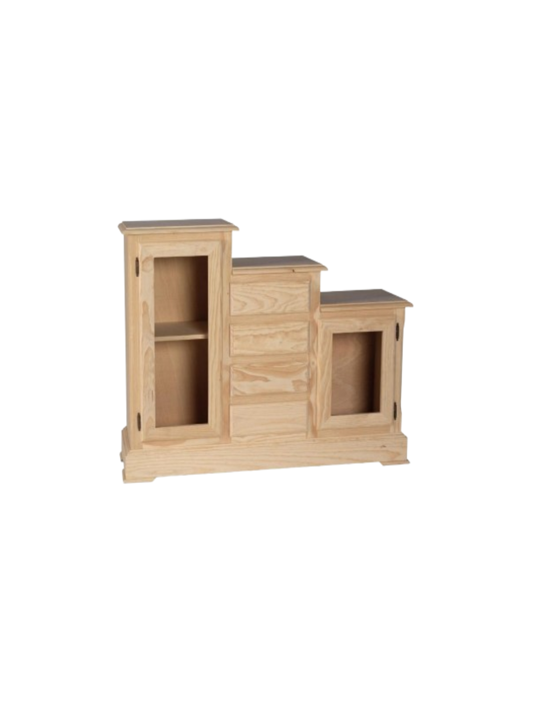 Su forma escalonada con altura ascendente a la izquierda permite integrarlo con estilo en espacios reducidos o en rincones con personalidad. Gracias a sus 2 puertas y 4 cajones, proporciona un almacenamiento eficiente para ropa, menaje, documentos o accesorios decorativos. Se puede servir en crudo o en cualquiera de los colores de la carta RAL, y cuenta con opciones de personalización de tiradores, lo que facilita su integración en ambientes tanto rústicos como modernos.